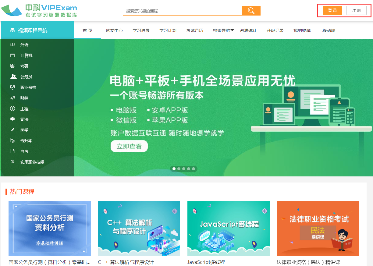 3、点击登录后,关于中科VIPExam考试库的内容一览无余,可在线学习。